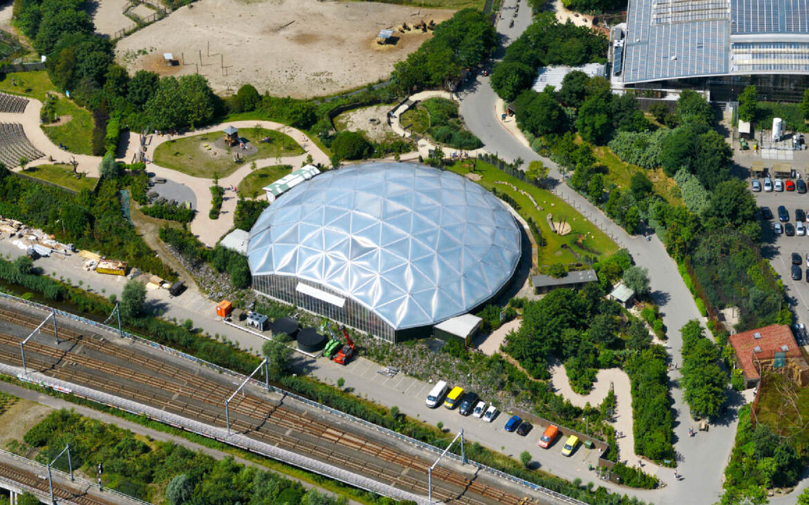 Easy transport and assembly: The parts of geodetic domes are relatively short and light, which is a major plus with regard to transport and assembly. The wooden poles and steel connectors are produced in Holland and transported to the building site in containers. The dome construction can be assembled without use of scaffolding.