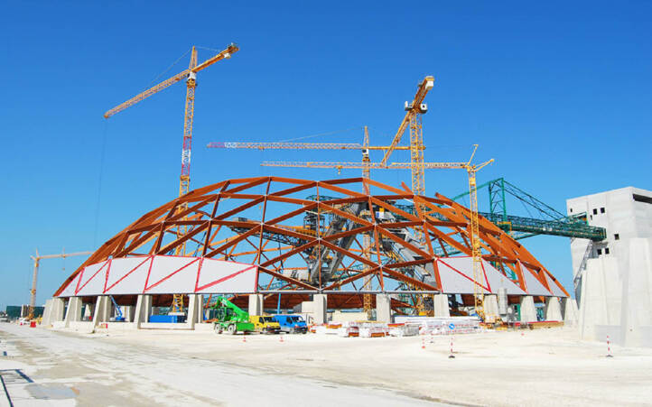 Geodesic domes for coal storage are under construction on behalf of Italy’s leading energy provider. The plan includes the largest domes in Europe with a diameter of 144 metres.