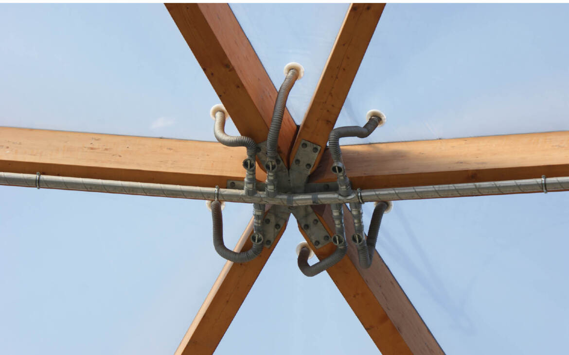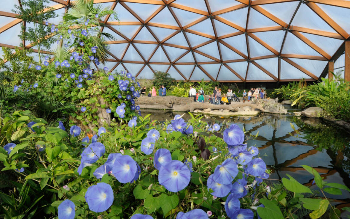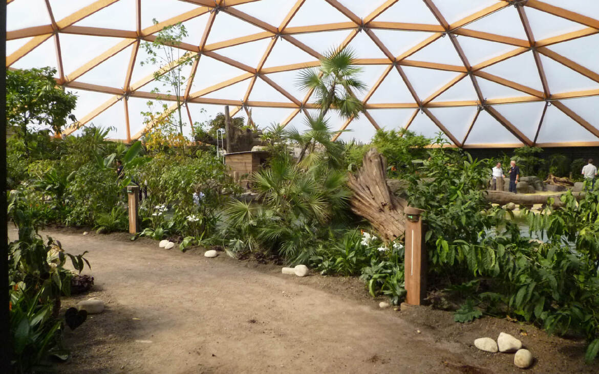 Amazonica is a new attraction in a new South-America themed zone of Rotterdam Zoo. The structure enclose a complete biotope of flora and fauna: a tropical rain forest with a river, reptiles, turtles and butterflies. The roof is built as a timber-framed geodesic dome with an infill of transparent, air-filled dual layer foil.