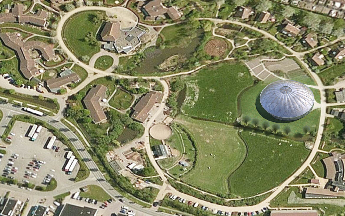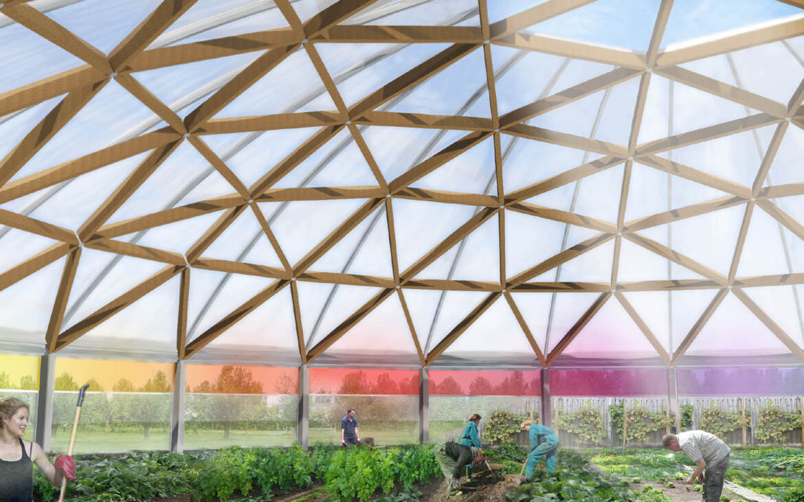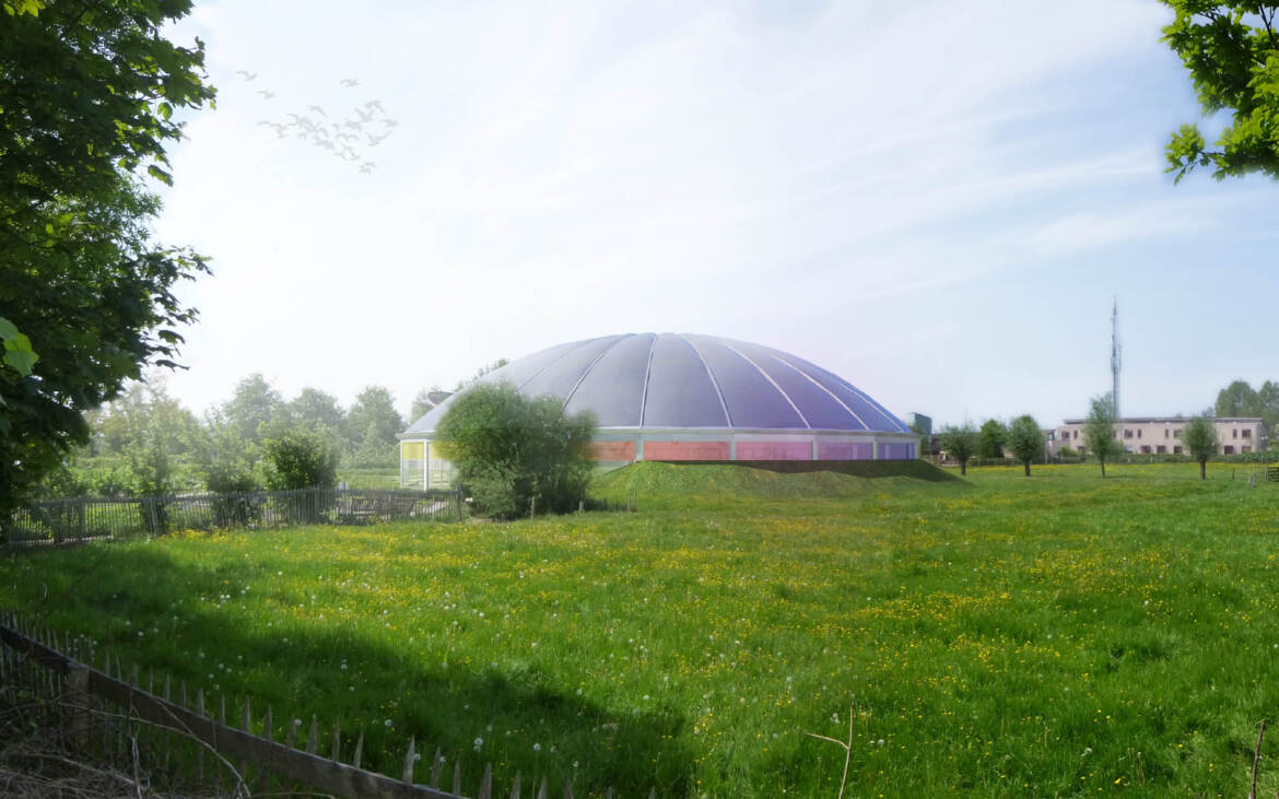 ZonKas is a greenhouse, a transparent space for the Breidablick live/work community in the Dutch village Middenbeemster. It consists of a geodesic dome beneath which the mentally handicapped residents can cultivate fruit and vegetables as a daytime occupation. The timber-framed dome has an infill of transparent air cushions which admits daylight deep into the interior.